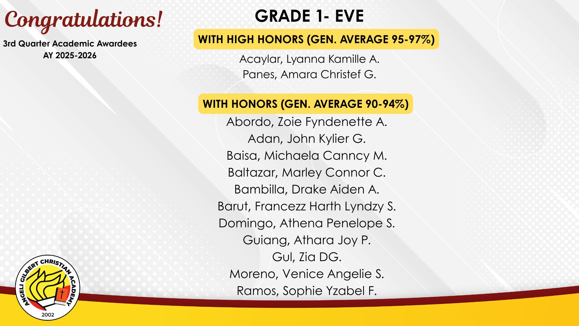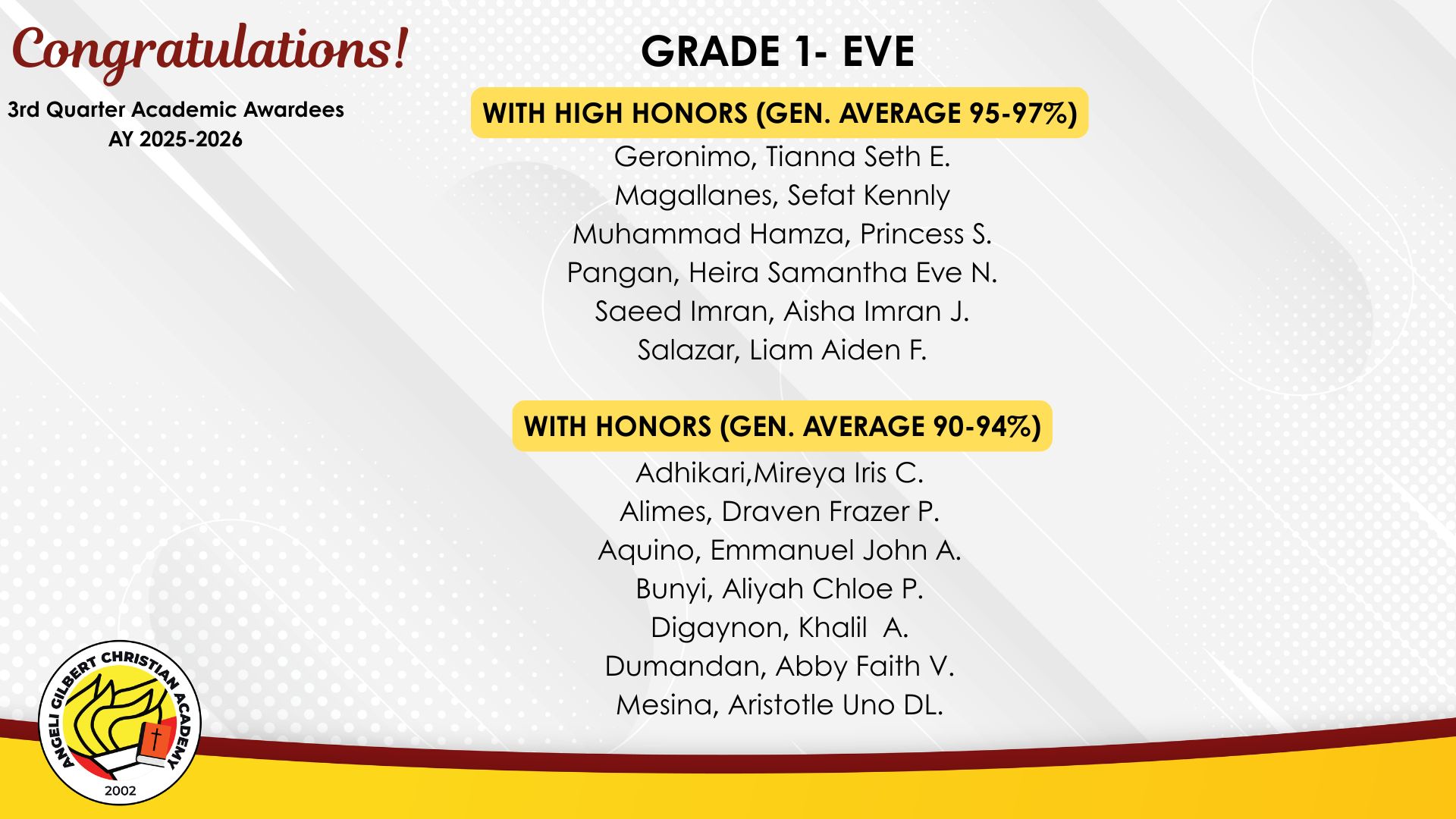 Grade 1 - Evening Class Awardees